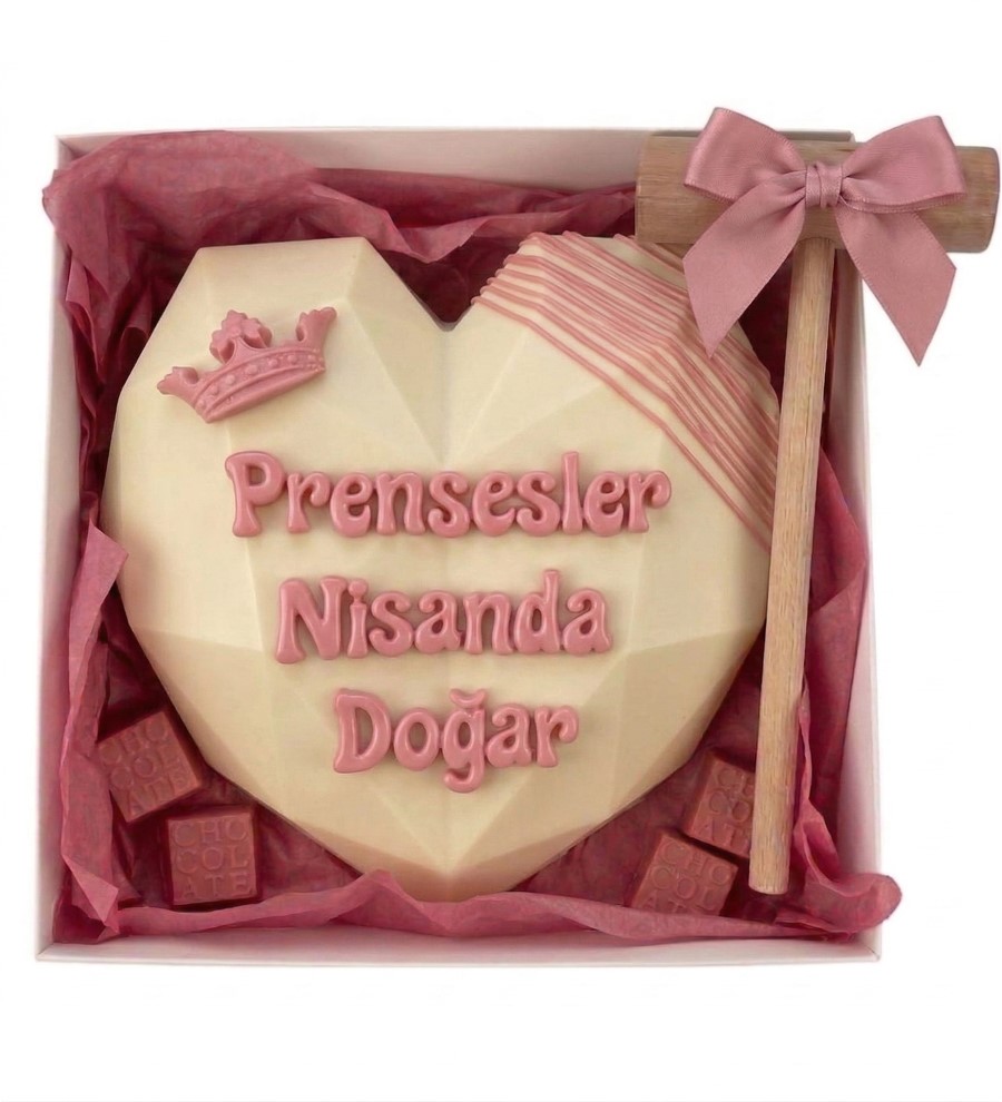 Kutunun yanında yer alan kurdele detaylı ahşap tokmak ile pinyatayı kırarak içindeki sürpriz çikolatalara ulaşabilirsiniz. Hem eğlenceli hem de tatlı bir deneyim sizi bekliyor!