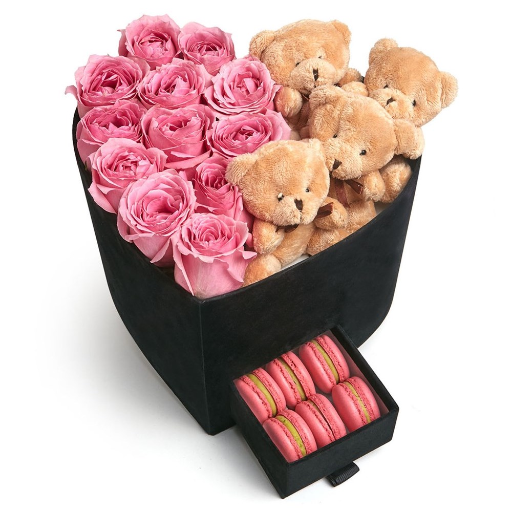 12 adet Gül, 4 adet Mini Ayıcık, 6 adet Macaron bulunmaktadır.