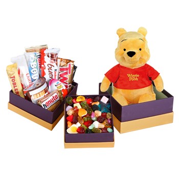 Göz alıcı mor ve gold renkli kutu ile hazırlanmış olandop dolu bu ürünle sevdiklerinizi mutlu edin, mutlu olun. Kutu 1: 400 gr karışık jelibon ve marsmallow Kutu 2: Twix, Kinder Bueno, 2x Hanuta, Nutella Go, Kinder Joy, Hanuta, Bounty, Raffaello, Toblerone Kutu 3: Seçtiğiniz peluş