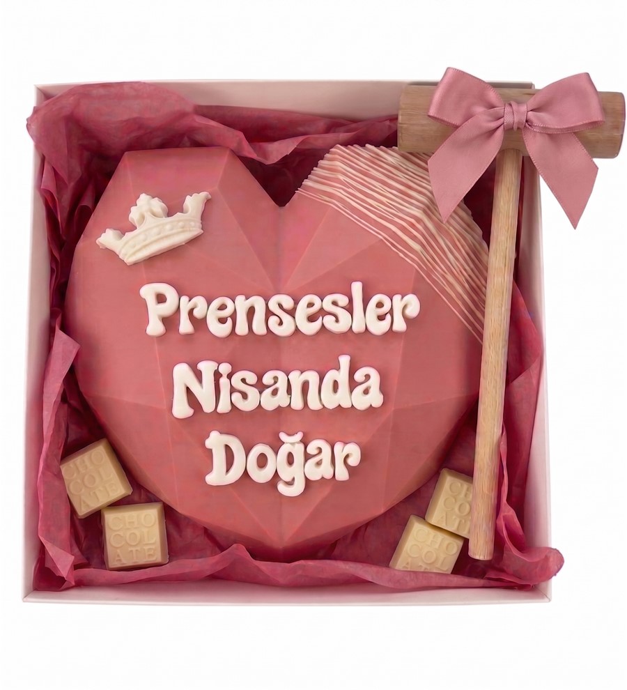 Kutunun yanında yer alan kurdele detaylı ahşap tokmak ile pinyatayı kırarak içindeki sürpriz çikolatalara ulaşabilirsiniz. Hem eğlenceli hem de tatlı bir deneyim sizi bekliyor!