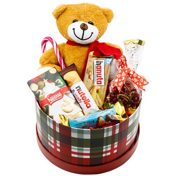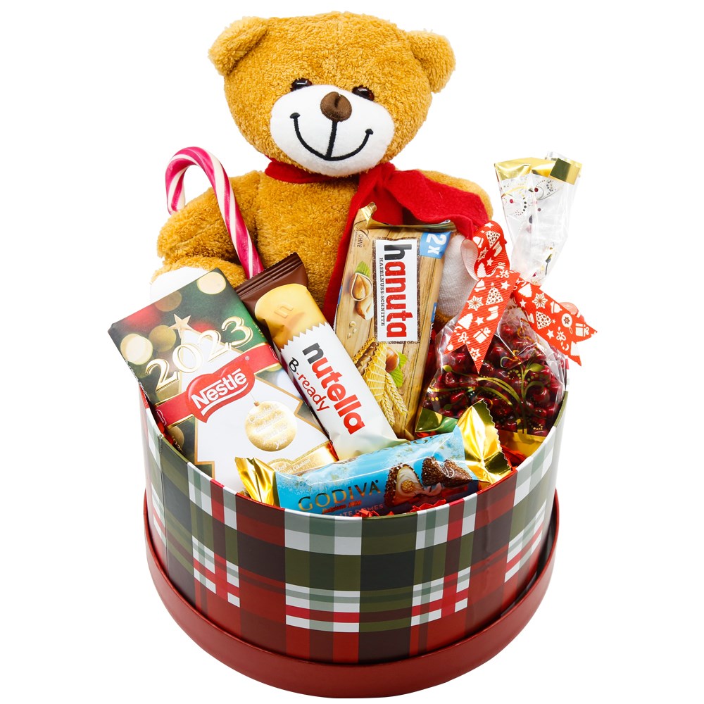 Ekose deseni ve kırmızı yılbaşı ağaç figürlü şık kutu ile sevdiklerize yeni yıl sürprizi yapın, mutlu edin mutlu olun. İçindekiler: 1 Adet Nestle 65 gram çikolata, 1 Adet Nutella Be-ready, 1 Adet Godiva Domes, 1 Adet Hanuta 2x, 1 Adet Baston Şeker, 1 Adet 200 gram karışık Böğürtlen Draje, 1 Adet 30 cm atkılı ayıcık