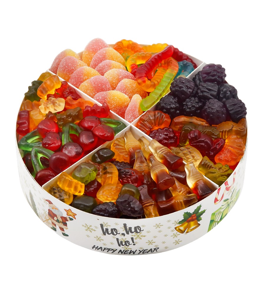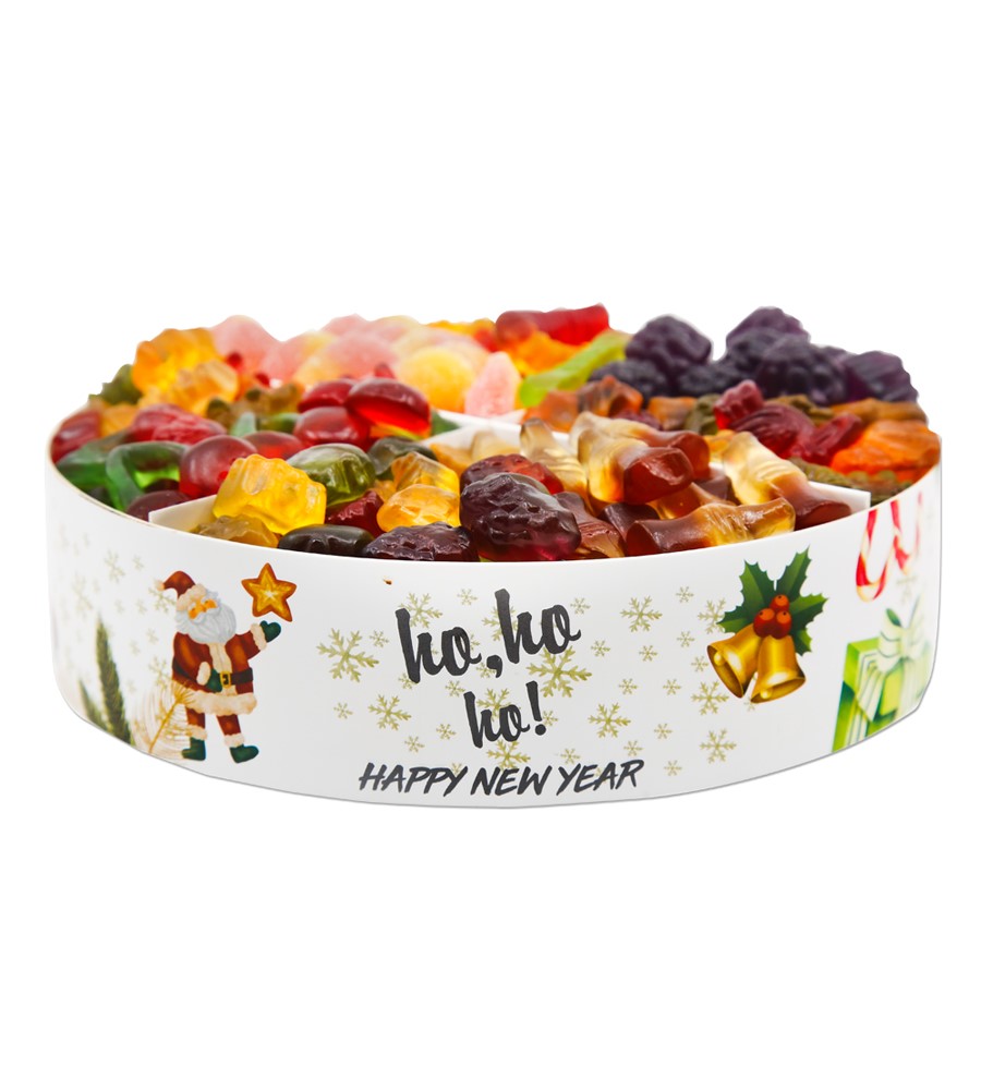 Yılbaşı desenli ürün içerisinde yaklaşık olarak 500 gram şeker bulunmaktadır. Ürün boyutu 20 cm çap 6 cm yüksekliktir.