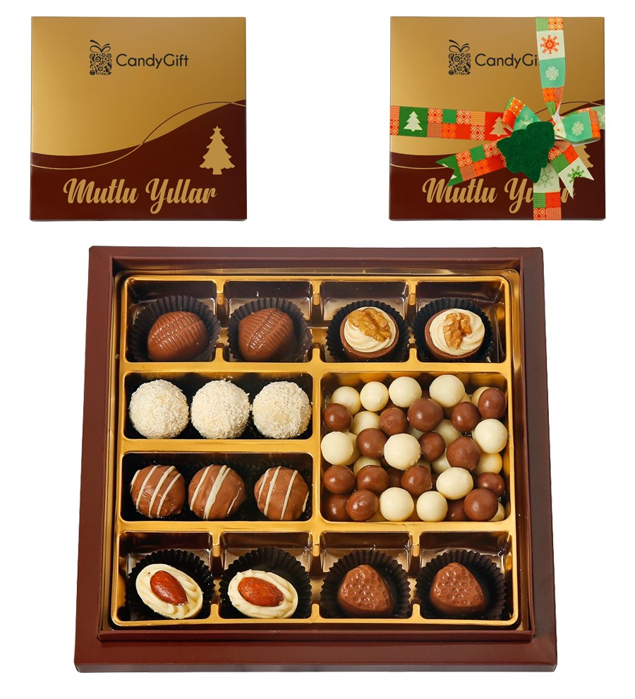 Kutu Ölçüleri: 23*22*4 Trüf Çikolata: 6 adet Spesiyel Çikolata: 8 adet Draje: 100 gram net