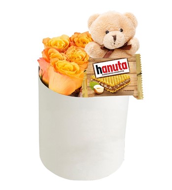 5 adet Gül, 1 adet Mini Ayıcık, 1 adet Hanuta bulunmaktadır.